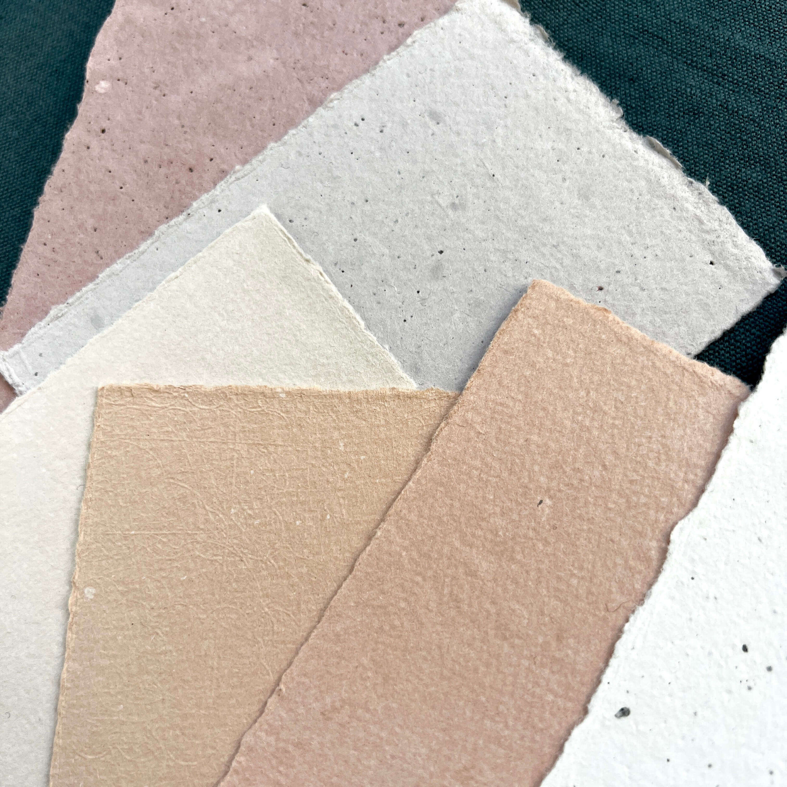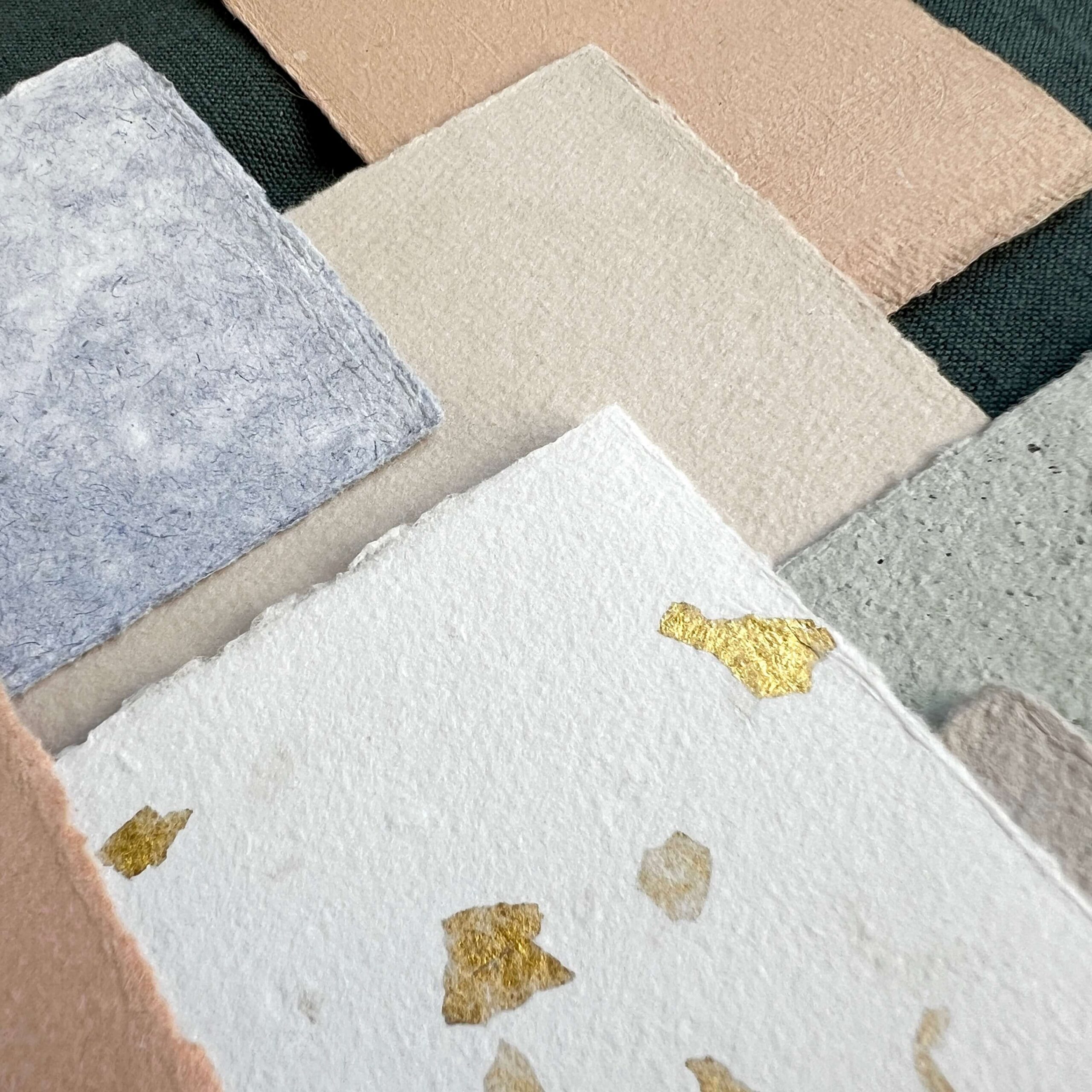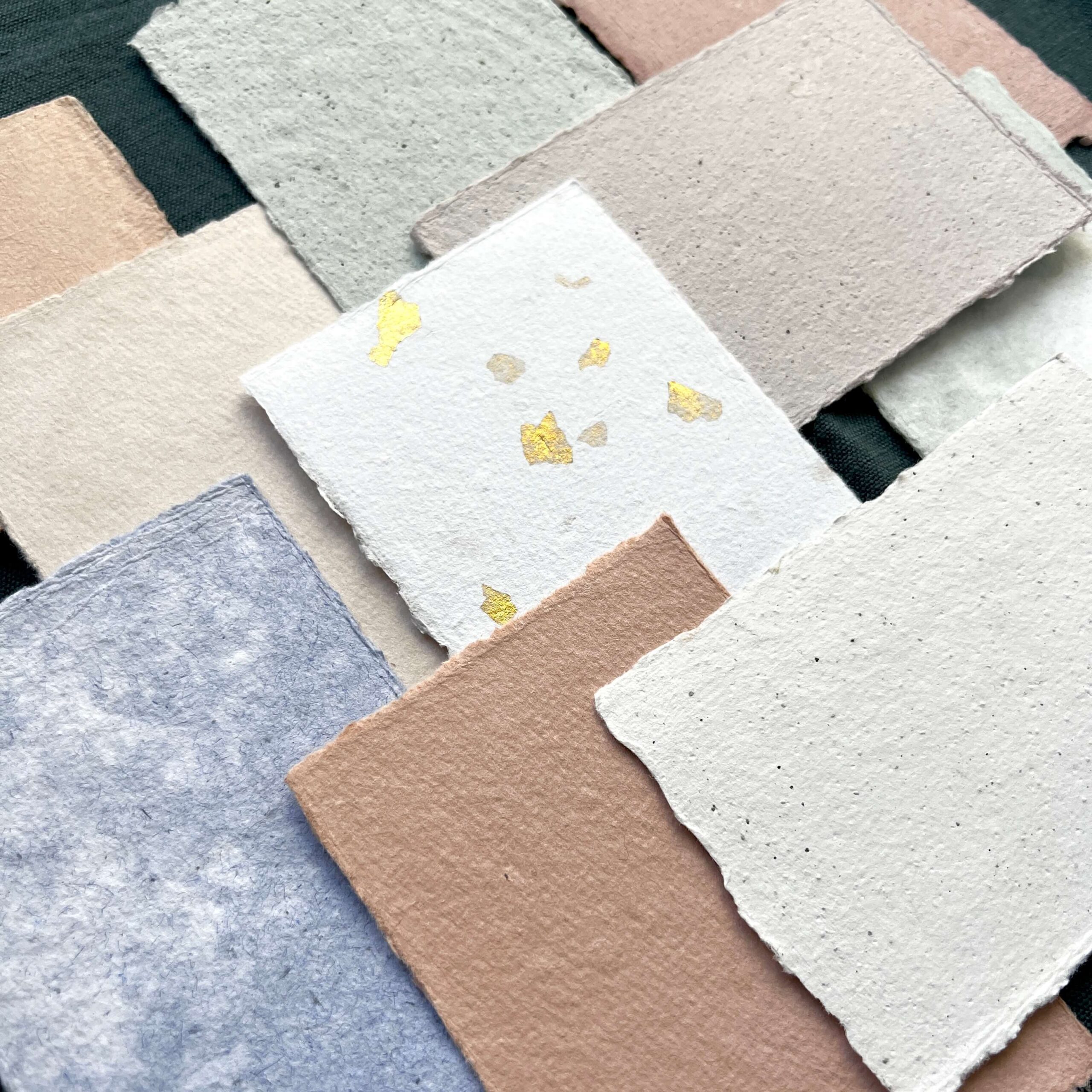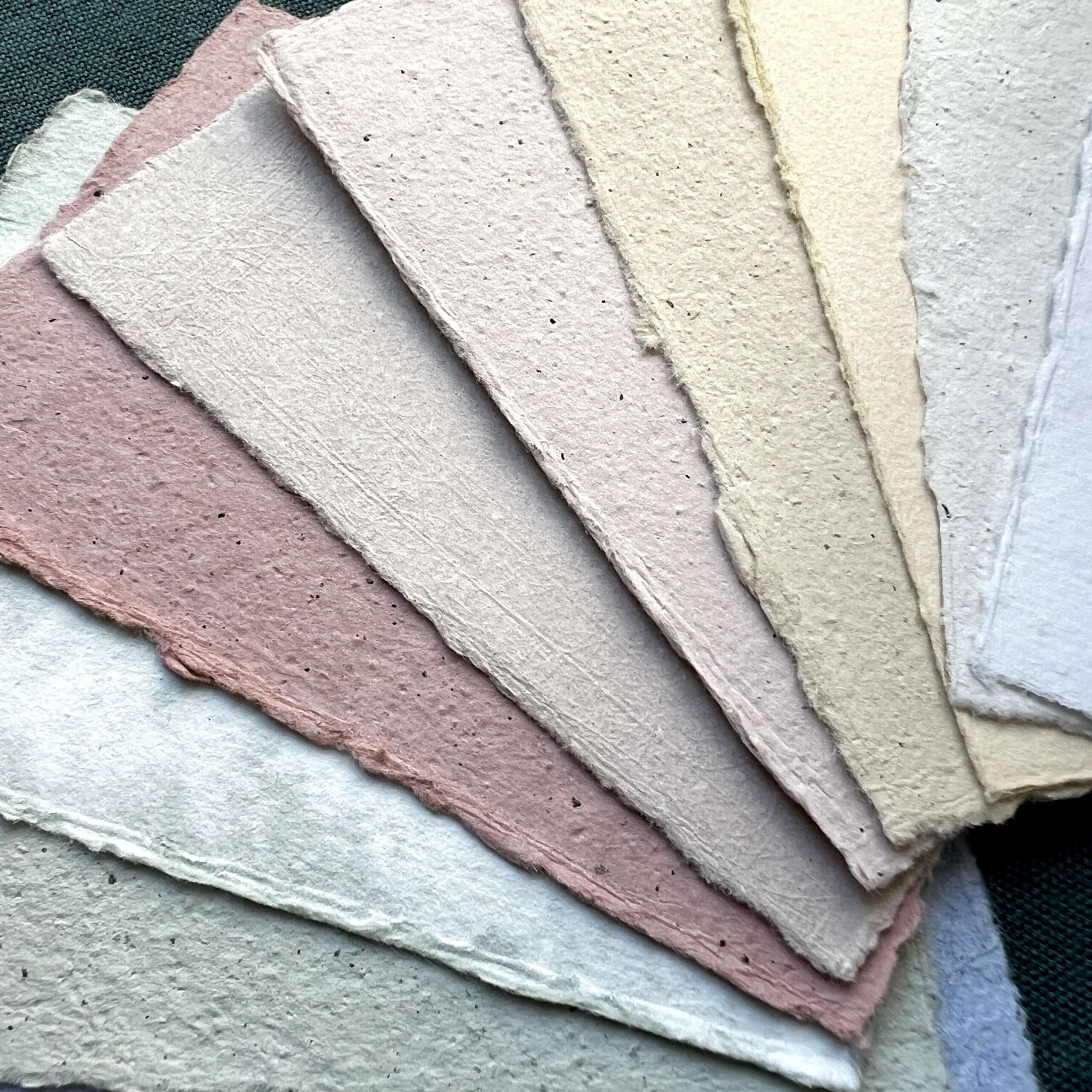 Lot de 10 petites feuilles de papier artisanal coloré, fabriqué à la main en France à partir de papier recyclé et de pigments naturels.
